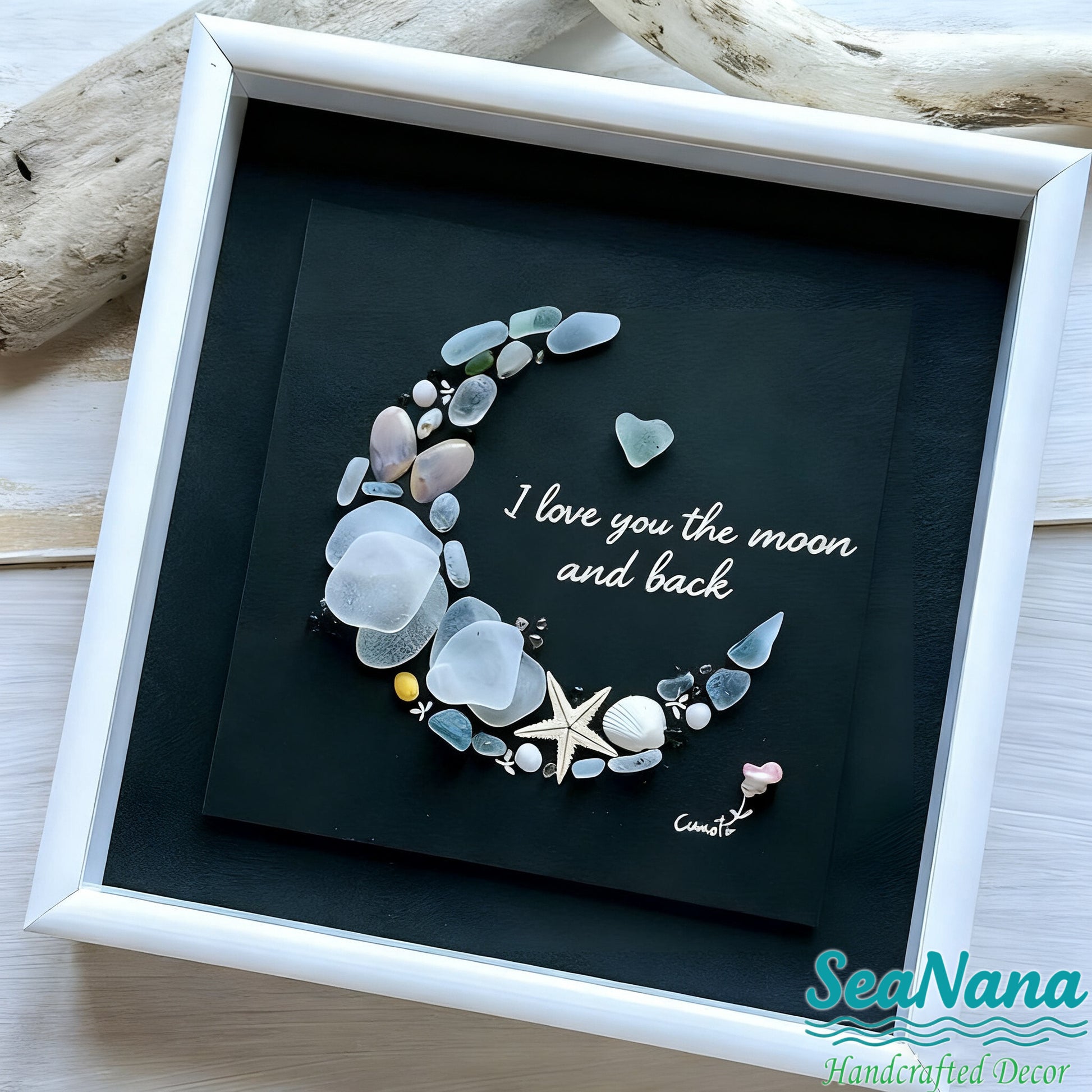 "I love you to the moon and back" is more than just a phrase—it’s a timeless declaration of love rooted in a classic children’s book. Designed for families and romantic partners, it communicates a profound, selfless, and warm feeling that defines true connection. This sea glass art piece brings that sentiment to life, making it a perfect keepsake for anyone you hold dear.
